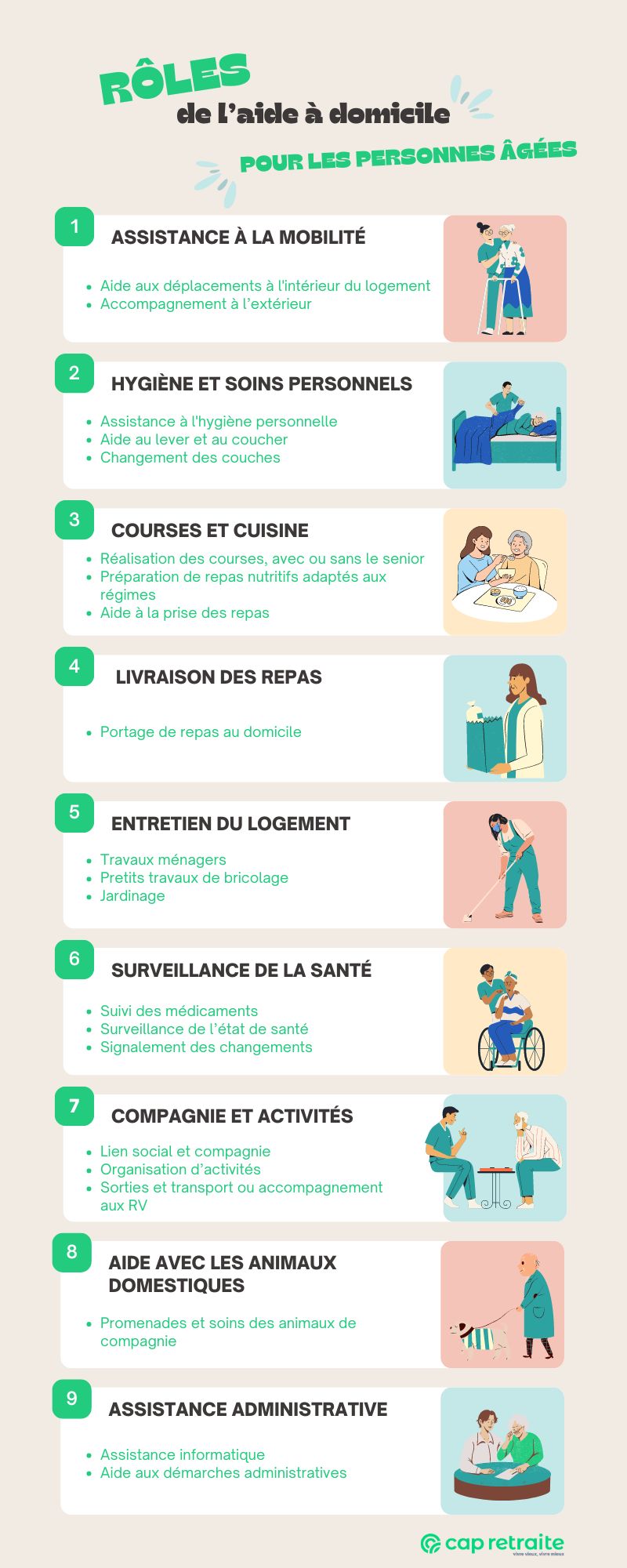 Voici une liste des soins et activités de l’aide à domicile :