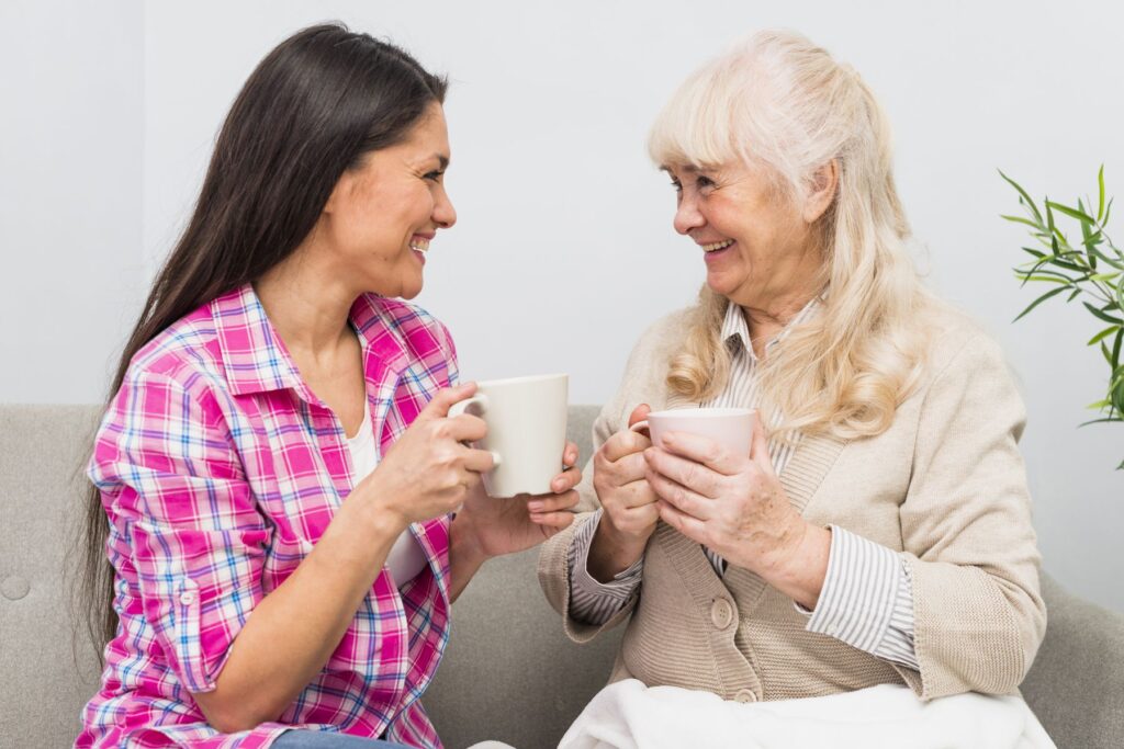 - Stimulation intellectuelle et sociale : Les discussions et les échanges avec les membres de la famille peuvent contribuer à maintenir l’activité cérébrale et les compétences sociales de votre parent, en lui donnant l’occasion de s’exprimer, d’échanger des idées et de partager son expérience.
