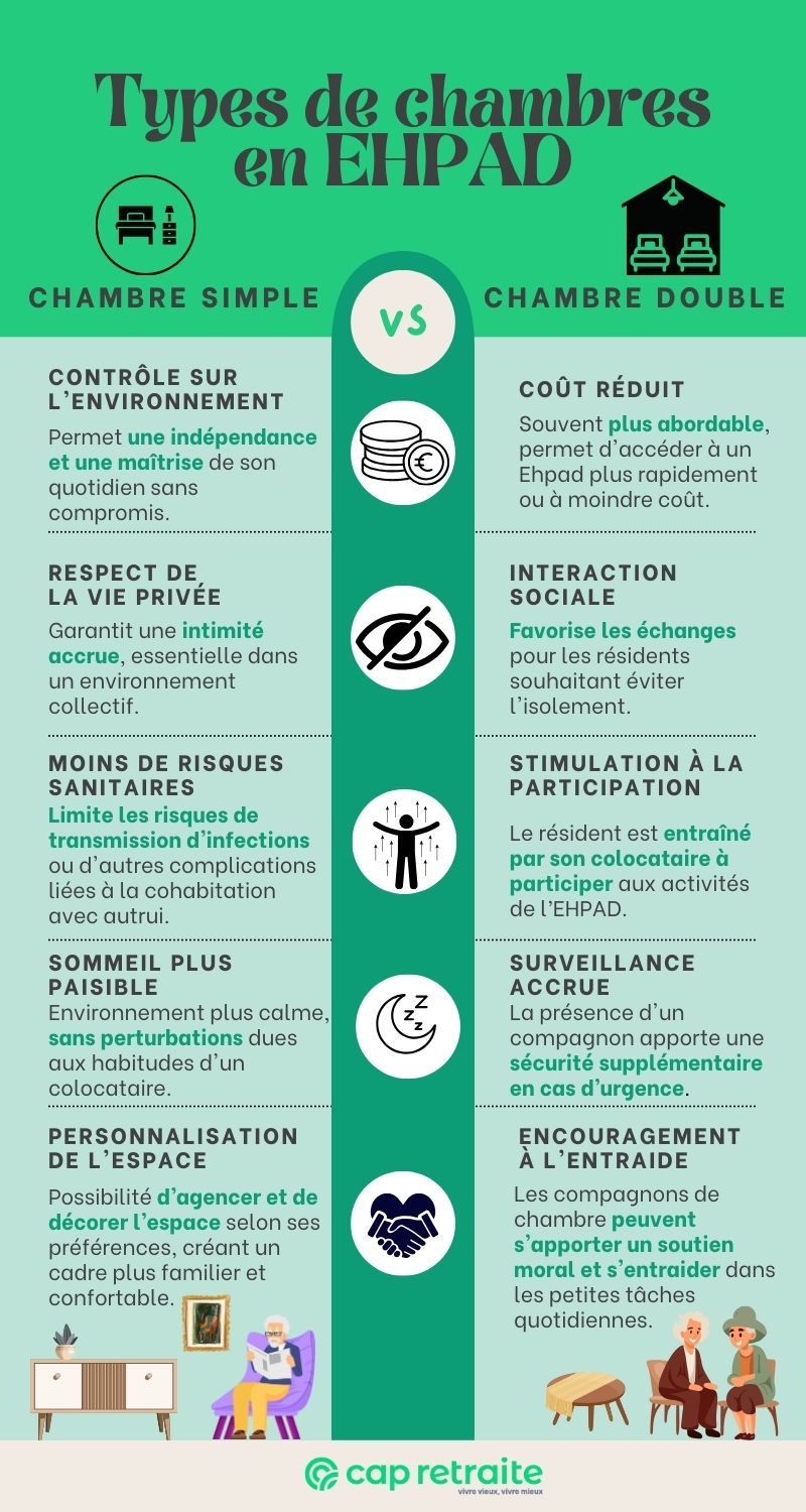 - Le contrôle sur son environnement : avoir votre propre chambre, en Ehpad comme partout ailleurs, constitue une forme de contrôle sur votre vie et est synonyme d’indépendance. Vivre avec une autre personne dans une chambre double signifie devoir s’habituer à la routine quotidienne, au comportement et aux activités d’une autre personne, et surtout composer avec ses goûts et ses préférences. Les principaux problèmes que vous risquez de rencontrer en partageant votre chambre en Ehpad sont d’ordre pratique :
