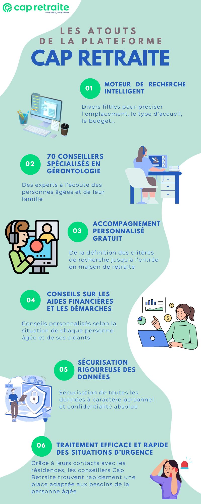 Pour les personnes qui rencontreraient des difficultés dans leurs démarches, sachez qu’un autre accompagnement gratuit et personnalisé existe pour permettre aux personnes âgées de trouver l’établissement idéal. Un conseiller Cap Retraite accompagne les demandeurs tout au long du processus afin de faciliter toutes les démarches administratives. L’accompagnement Cap Retraite a déjà permis d’aider des milliers de familles et les aide à concrétiser leurs démarches depuis plus de 25 ans.