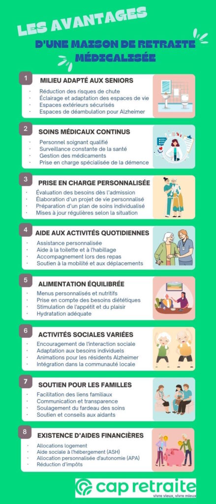 Ainsi, les maisons de retraite médicalisées ont l’avantage d’offrir une gamme complète de prestations essentielles pour les personnes âgées. De l’assistance médicale continue aux activités sociales enrichissantes, en passant par l’aide dans les activités quotidiennes, elles fournissent un environnement sécurisé et stimulant. En outre, l’accès à diverses aides financières allège le fardeau économique pour les résidents et leurs familles.