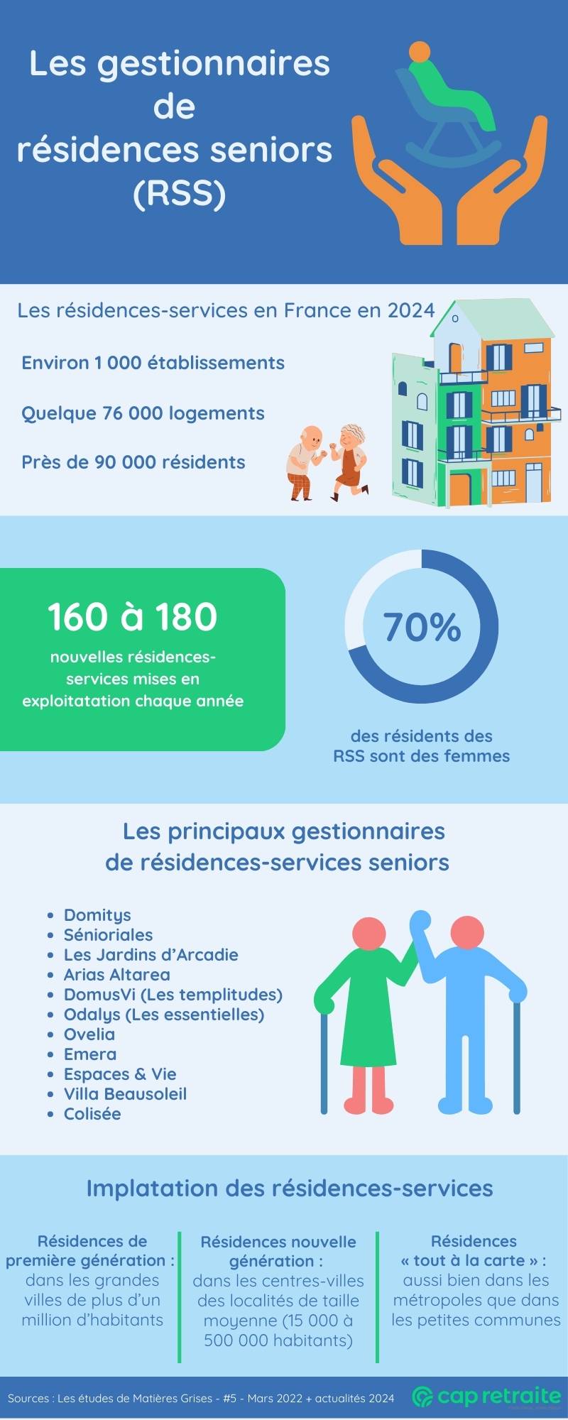 En 2024, le parc des résidences-services compte environ 1 000 structures, représentant quelque 76 000 logements et 87 000 personnes âgées accueillies. Ces structures appartiennent essentiellement à une quinzaine d’acteurs dominant le secteur des résidences seniors. Domitys est le gestionnaire de résidences-services en tête du classement depuis plusieurs années.