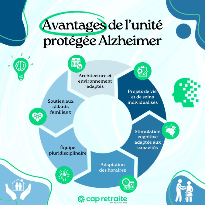 - un environnement architectural adapté : l’aménagement permet de faire de l’unité protégée Alzheimer un lieu de vie chaleureux (grâce à des éléments familiers, la décoration, des plantes…). Il permet la libre circulation et un meilleur repérage des résidents désorientés dans un environnement sécurisé (avec des dispositifs anti-fugue : portes protégées par des digicodes, vidéosurveillance, géo-localisation, fenêtres oscillo-battantes…).