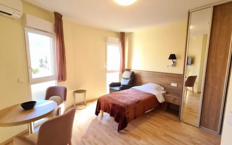 (personnes à mobilité réduite), ils bénéficient des dernières innovations techniques : système douche, sol souple, double vitrage, climatisation réversible, volets roulants automatiques, mobilier de qualité hôtelière, cuisine entièrement équipée, appel d’urgence et détection incendie.