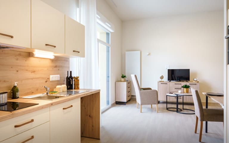 Les appartements, du studio au T2, sont spacieux et entièrement équipés avec cuisine, salle de bains avec douche à l'italienne et mobilier intégré.
