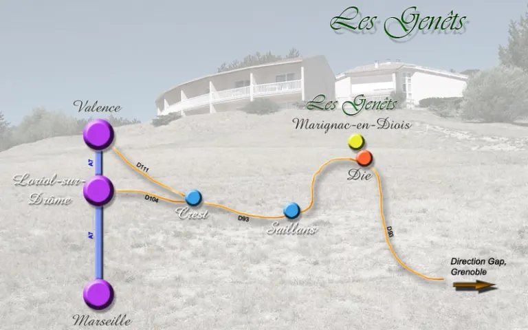 Située à Marignac-en-Diois dans la Drôme, à 650 mètres d’altitude, au cœur du parc naturel du Vercors, la résidence « Les Genêts » vous offre le calme et la beauté de son site privilégié au milieu d’un paysage de pins et de lavande.