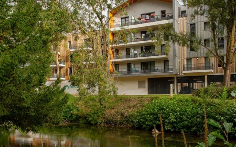 Installée en lieu et place des anciennes écuries d’une caserne militaire, la résidence profite d’une situation idéale entre la ville, la nature et l’eau.
