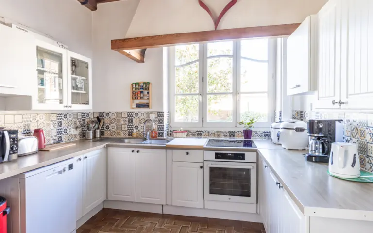 Le rez-de-chaussée comprend un séjour lumineux ouvert sur le jardin, et une cuisine avec une grande table pour les repas.