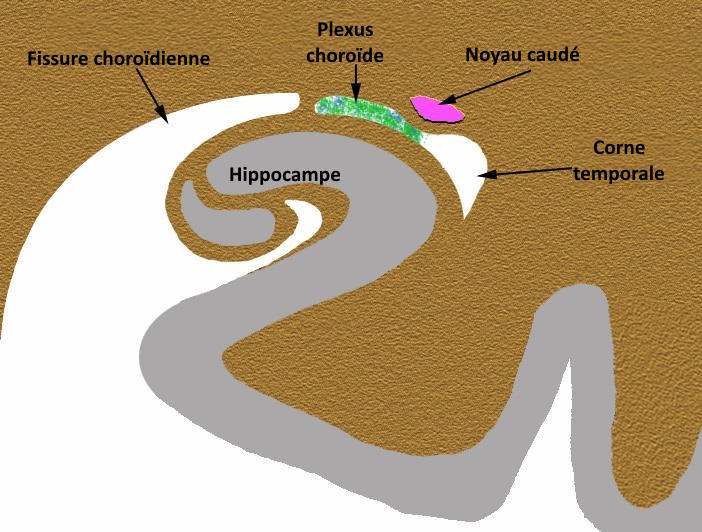 De même, un élargissement de la corne temporale du ventricule latéral est observé en cas d’atrophie hippocampique ou de perte de tissu cérébral dans cette région.