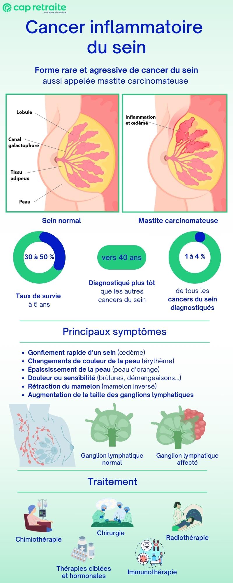 Le cancer inflammatoire du sein est un type de cancer rare et agressif, nécessitant une prise en charge rapide. Ses symptômes, qui peuvent ressembler à ceux d’une inflammation du tissu mammaire (mastite), entraînent parfois un retard de diagnostic. Le traitement, intense et combiné, inclut la chimiothérapie, la chirurgie et la radiothérapie.