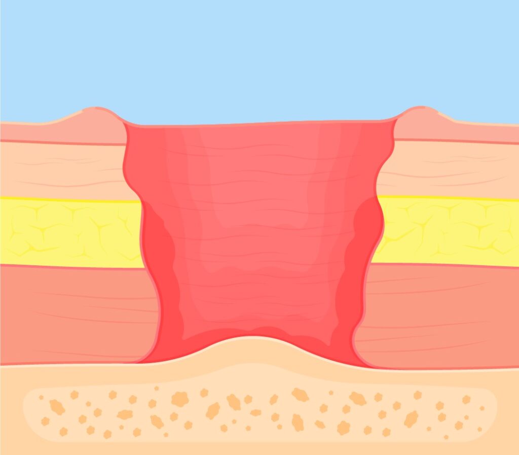 La peau et les tissus sous-jacents sont gravement endommagés : on dit qu’il y a ulcération. La plaie cutanée est étendue et profonde. Les muscles, les os, les tendons ou les articulations peuvent être nécrosés et exposés.